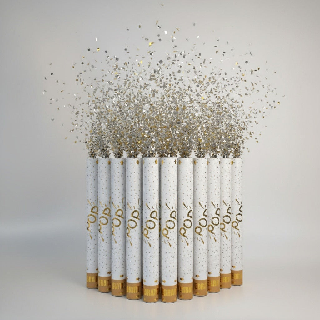 ✅ 12 Party Poppers of Your Choice – Choose from our iconic Gold Confetti Cannons, Silver Confetti Cannons, or our luxe Feather Cannons for that next-level flair. Mix and match to suit your vibe!