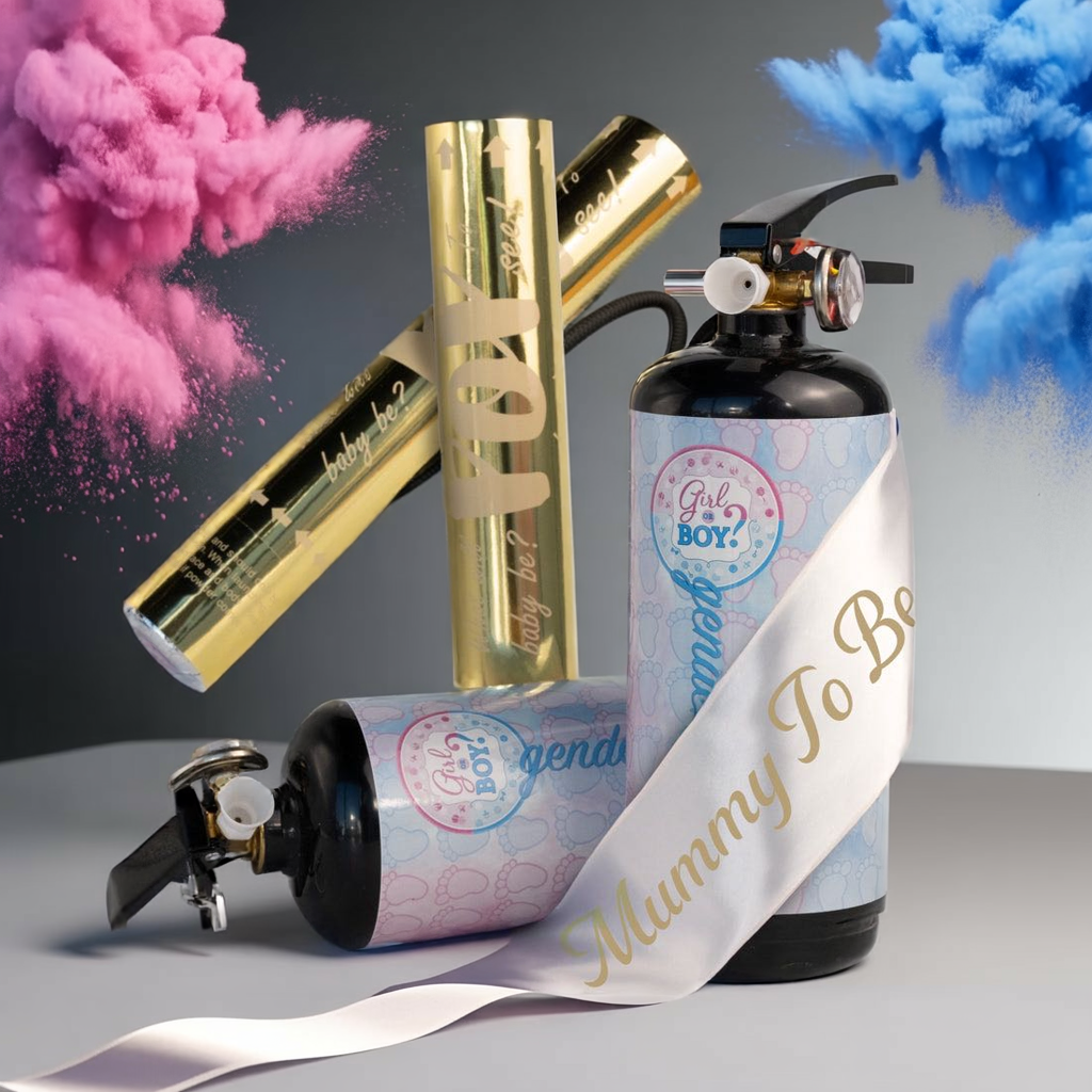 What’s Included: 🔥 2 x Large Gender Reveal Extinguishers 🎉 1 x Pack of Gender Reveal Poppers 💖 1 x "Mummy To Be" Sash